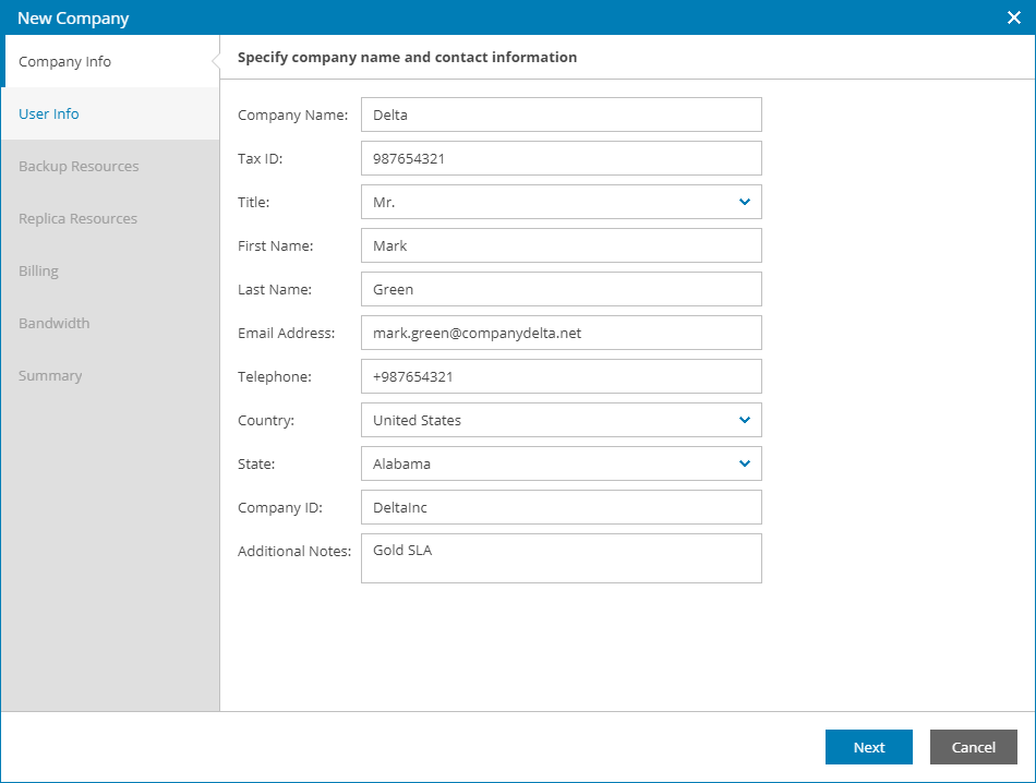 At the Company Info step of the wizard, specify general company details:
