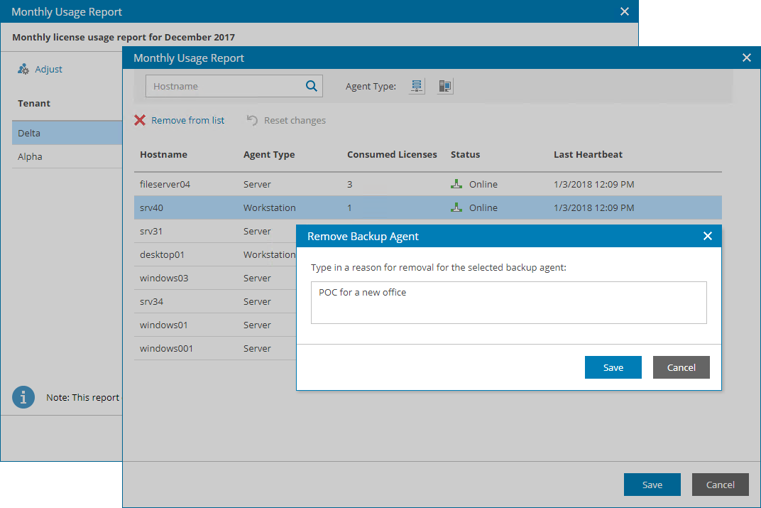 Before you submit a license usage report, you can view it, and, if necessary, adjust the number of managed Veeam backup agents for separate companies. For every change in the report, you must specify a reason.