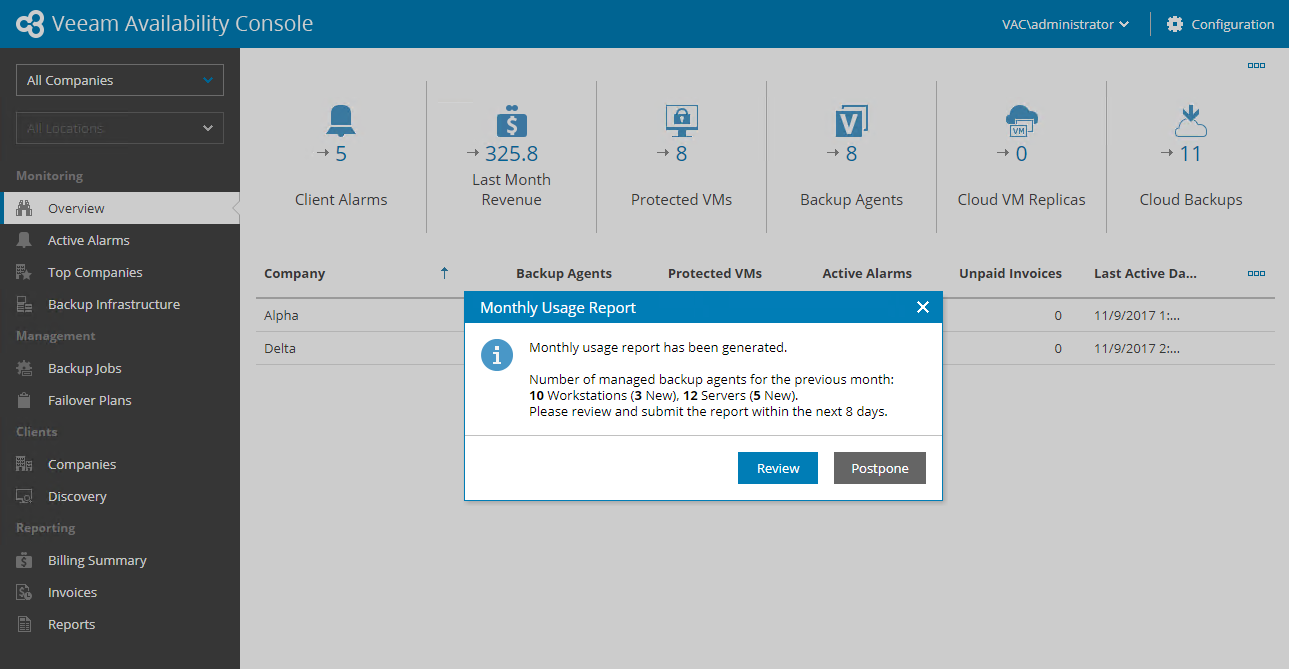 Starting from the first day of the month (and up to, and including the tenth day of the month), when you access Veeam Availability Console as a Portal Administrator, the product will notify you that a license usage report was generated.