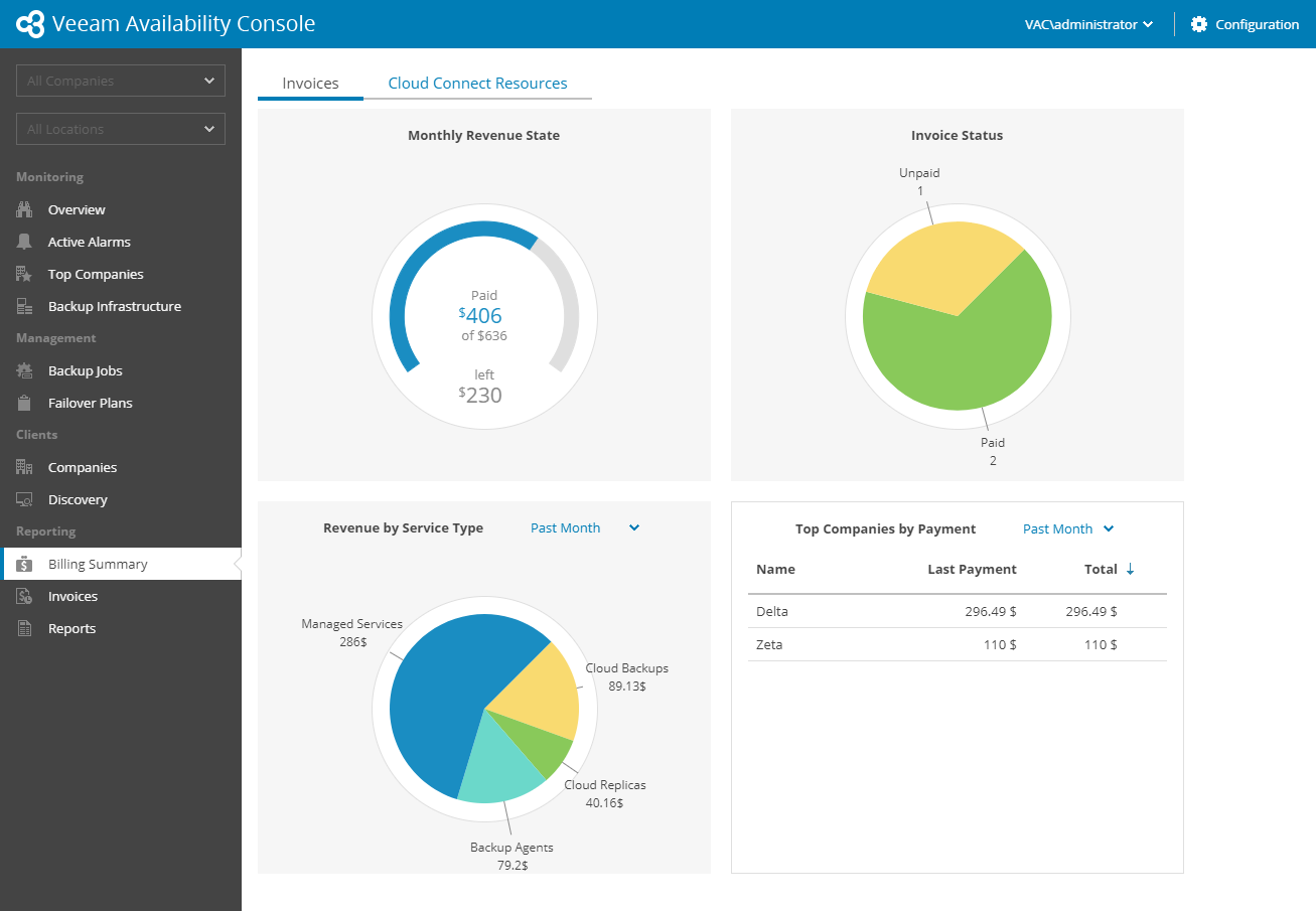 - To show data for a specific company and/or location, use company and location filters at the top left corner of Veeam Availability Console.