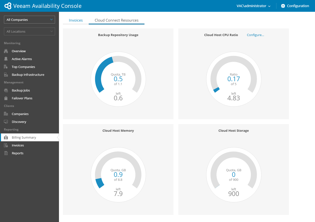 This dashboard view shows summary information about Veeam Cloud Connect resources consumed by companies.