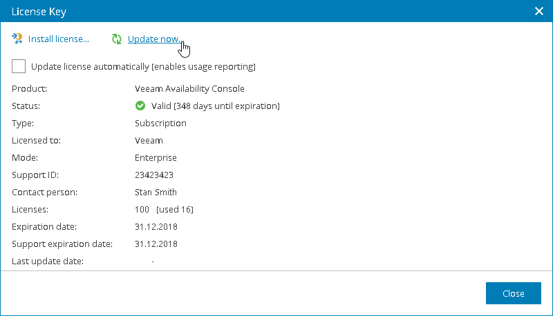 Veeam Availability Console will connect to the Veeam License Update Server on the Internet, download a new product license from it (if available), install it, and display a dialog box with the license update status.