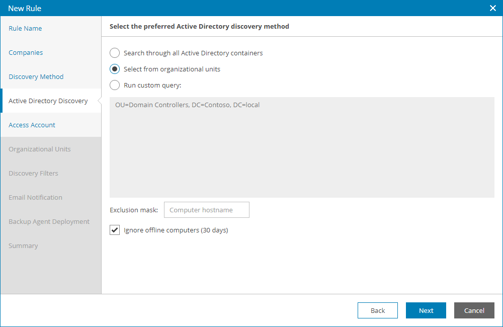 To identify computers in the client infrastructure, and then install and configure Veeam backup agents on these computers, you must configure a discovery rule. In this scenario, you will configure a rule that will perform discovery and installation procedures for computers within an AD domain.