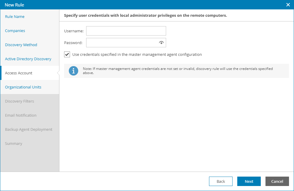 - At the Access Account step of the wizard, make sure that the Use credentials specified in the master management agent configuration check box is selected.