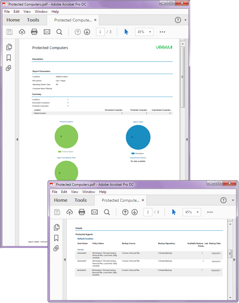 To analyze the efficiency of data protection implemented with Veeam backup agents, you can create the Protected Computers report. This report examines whether managed computers have valid backup restore points created within the specified time range (RPO period), and provide information on the completion status of recent backup job sessions.