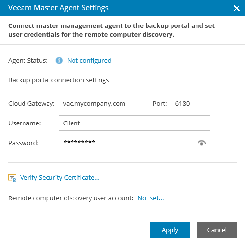 - In the Veeam Master Agent Settings window, specify settings that the agent must use to connect to Veeam Availability Console.