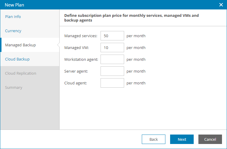To calculate the cost of managed backup services provided to a company, you must create a subscription plan. A subscription plan acts as a price sheet: it describes how much you, as a service provider, will charge for each service, and includes additional details, such as the payment currency, tax and discount amounts.