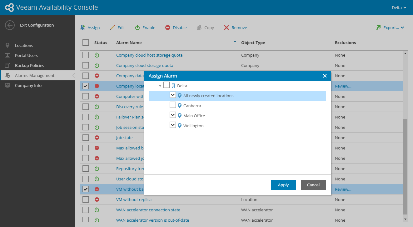 After you exclude one or more locations from the alarm assignment scope, you can check the excluded objects. To do so, find the necessary alarm in the Alarms Management list and click the Review link in the Exclusions column. In the Assign Alarm window, check and modify the alarm assignment scope if required.