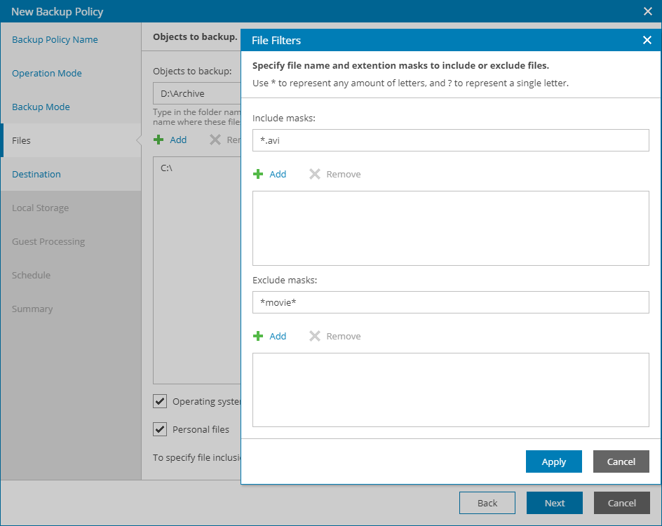 • In the Include masks field, specify file names and/or masks for file types that you want to back up, for example, MyMovie.avi,*filename*, *.docx, *.mp3. Veeam backup agent will create a backup only for selected files. Other files will not be backed up.