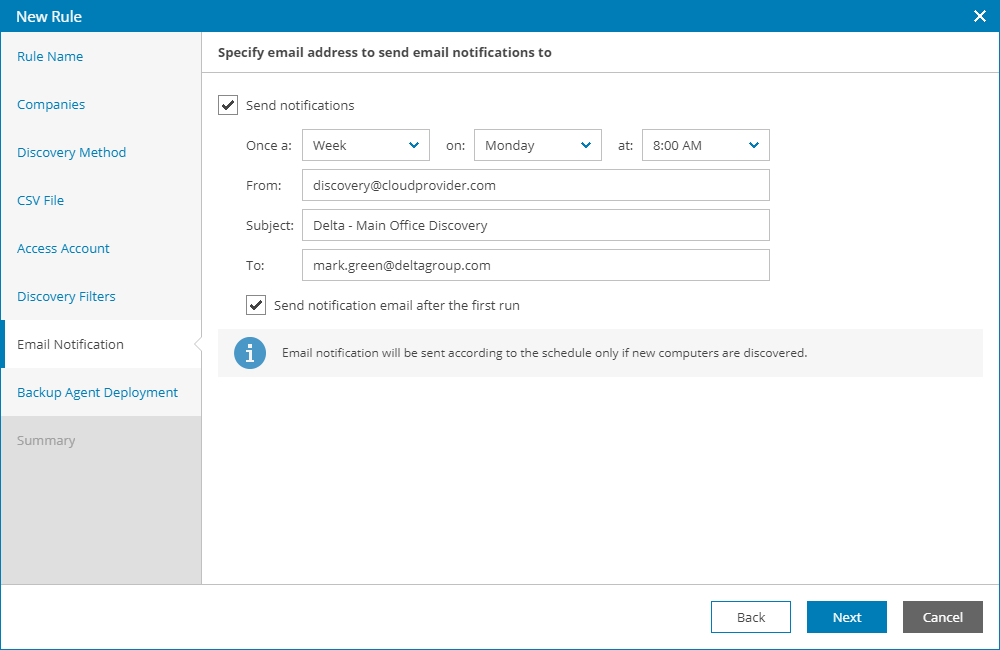 Discovery email notifications include a list of new computers discovered since the latest email notification. If no changes are detected since the latest email notification (no new computers are discovered), Veeam Availability Console will not send a new email notification about discovery results.