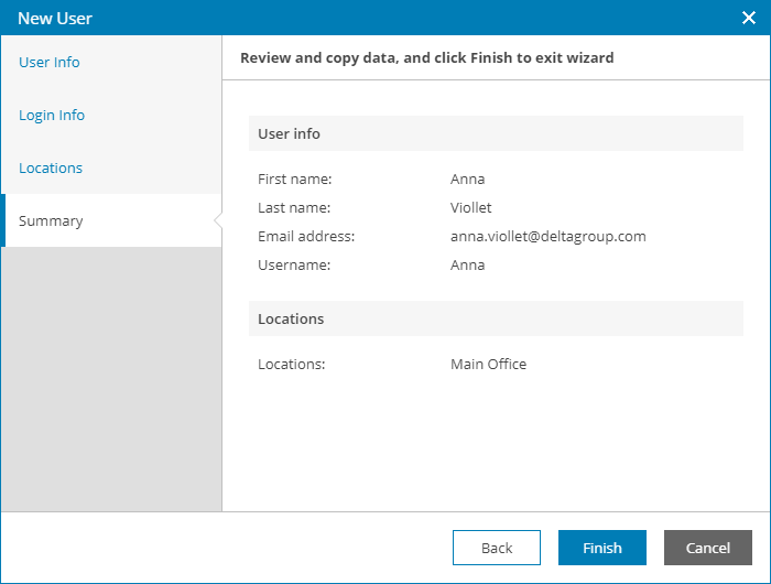 - At the User Info step of the wizard, specify user's title, first name, last name and email address.
