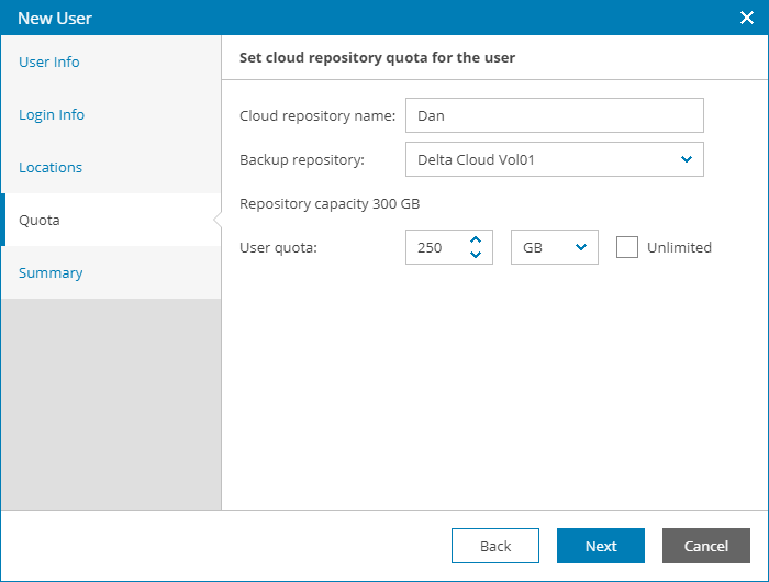 - At the Quota step of the wizard, allocate cloud repository resources to the user.