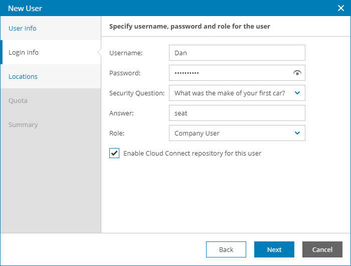- At the Login Info step of the wizard, specify user credentials and choose a user role: