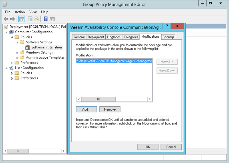 - Open the Modifications tab, click Add and choose the MST file located on the network share.