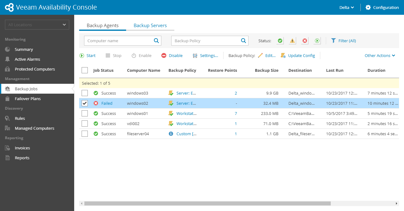 Veeam Availability Console will display a list of jobs for managed Veeam backup agents.