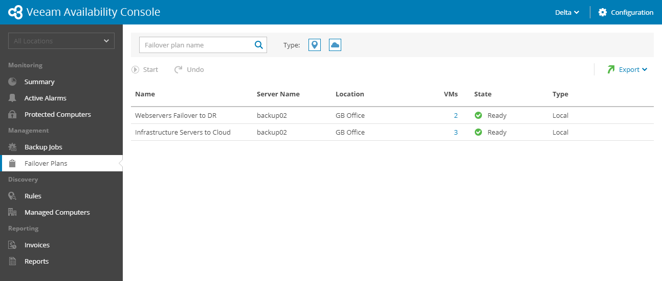 Veeam Availability Console will display a list of all failover plans configured on managed backup servers.