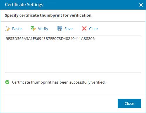 - In the Specify certificate thumbprint for verification field, paste the thumbprint of a certificate that is installed on the Veeam Availability Console and Veeam Cloud Connect servers.