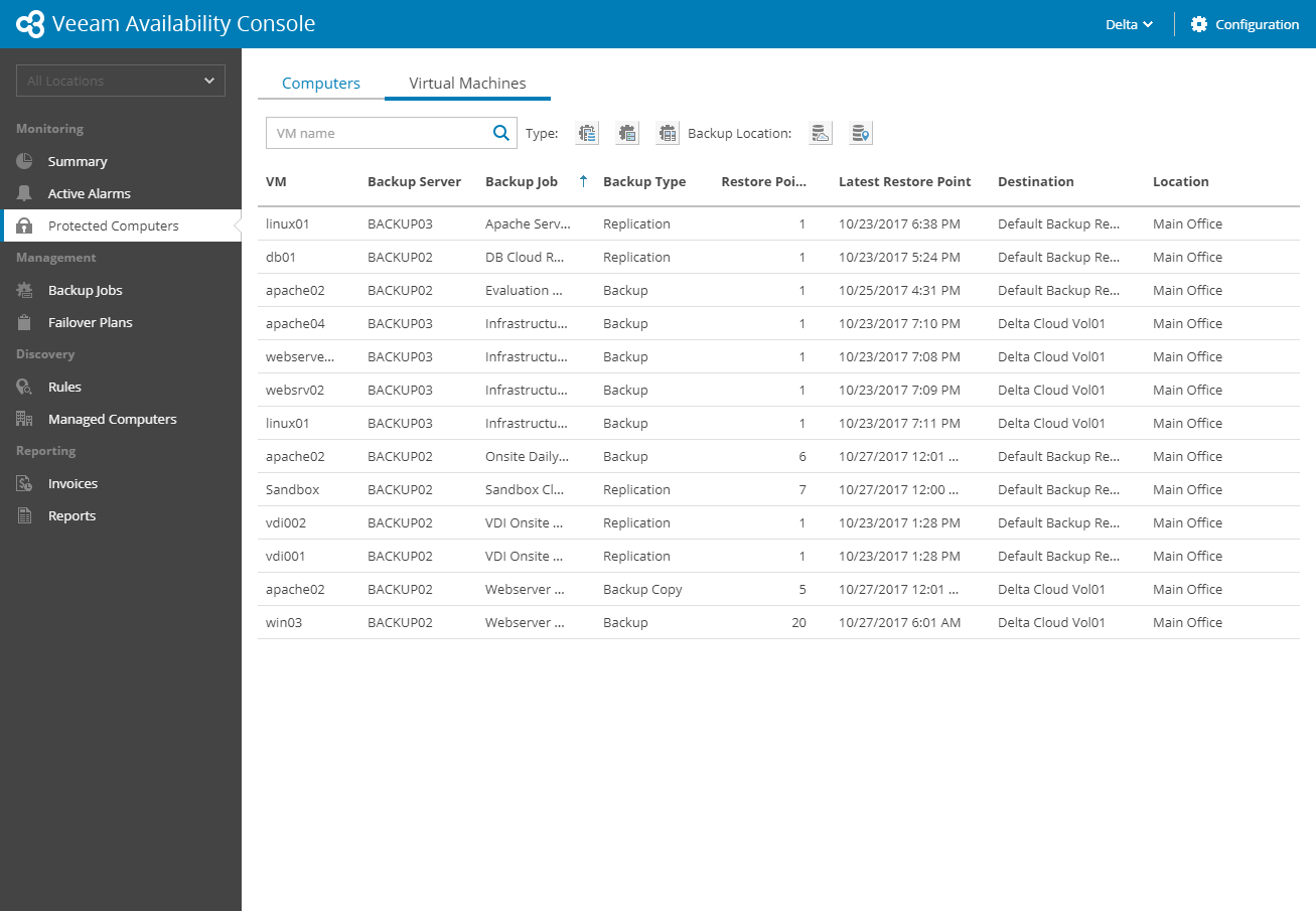 - Type — limit the list of VMs by job type (Backup, Replication, Backup copy).