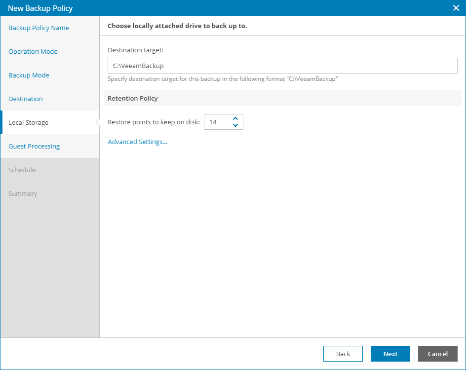 The Local Storage step of the wizard is available if at the Destination step you have chosen to save the backup on a local drive of the computer.