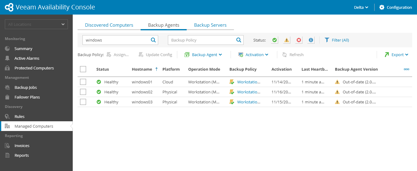 Otherwise, you can sort Veeam backup agents in the list by values in the Backup Agent Version column. For Veeam backup agents that can be updated, the column displays a warning icon with the Out-of-date value.