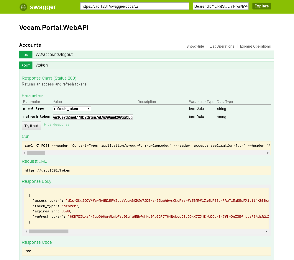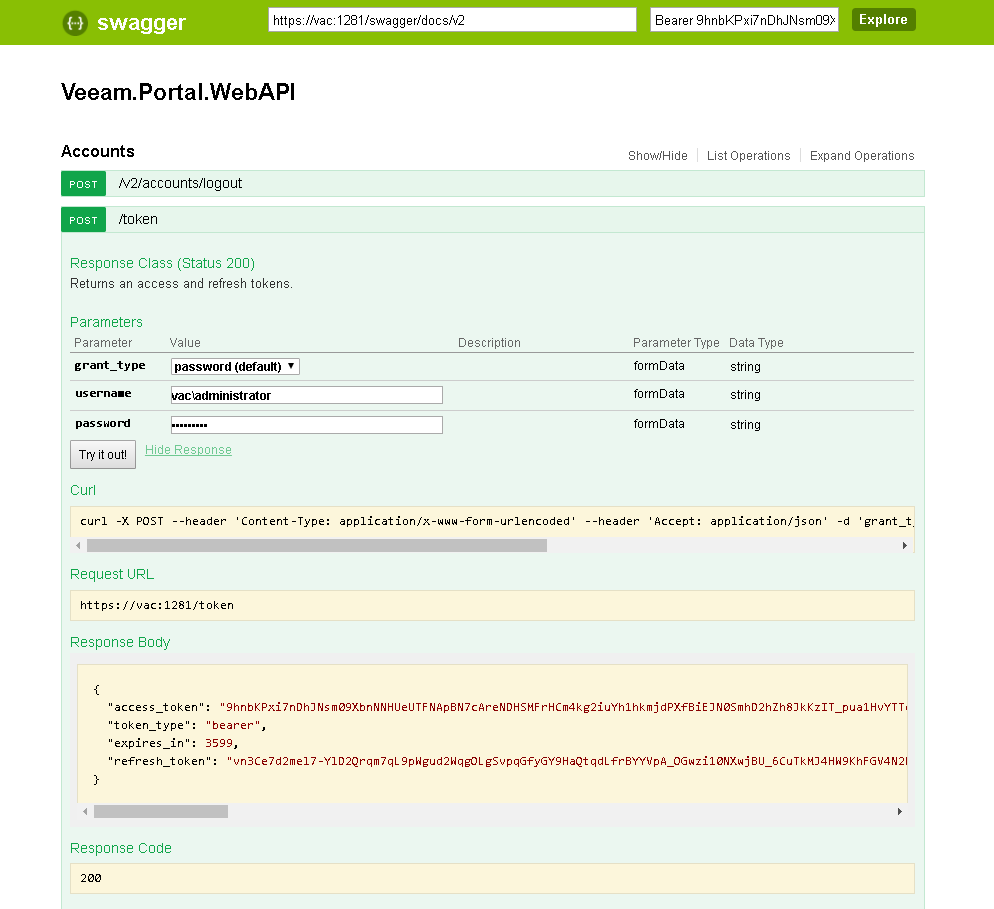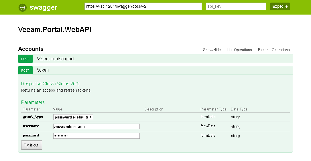 - On the Veeam.Portal.WebAPI page, expand the Accounts resource and click POST /token.