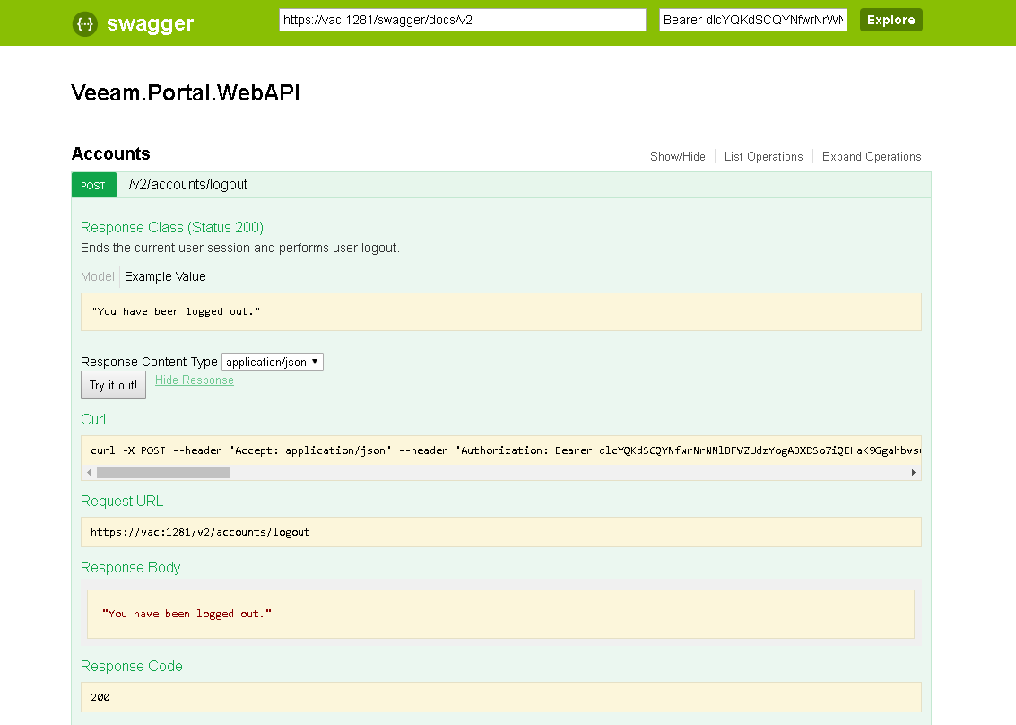 - On the Veeam.Portal.WebAPI page, expand the Accounts resource and click POST /accounts/logout.