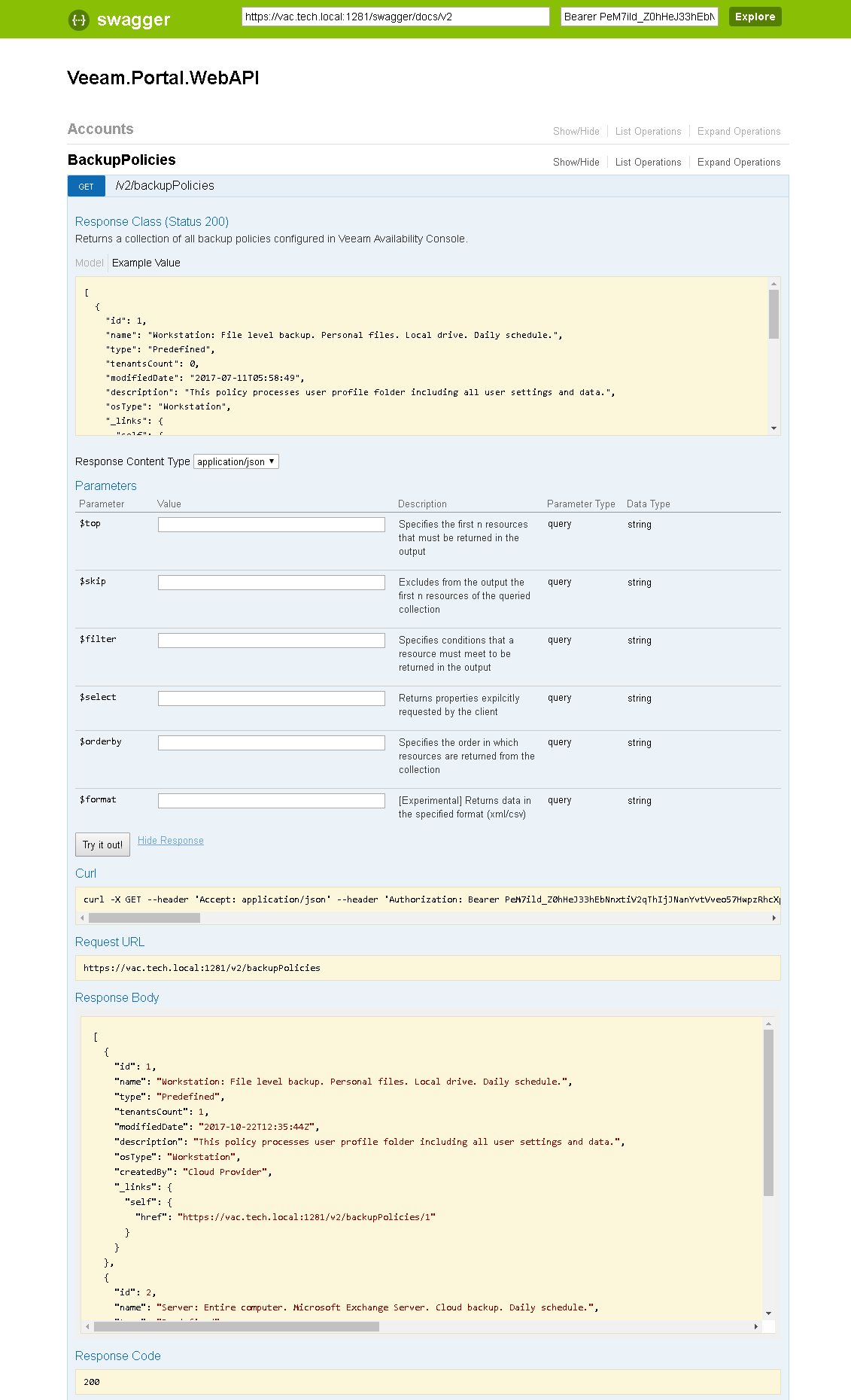 After you get an authorization token, you can send HTTPS requests to Veeam Availability Console RESTful API collections and resources in Swagger UI.