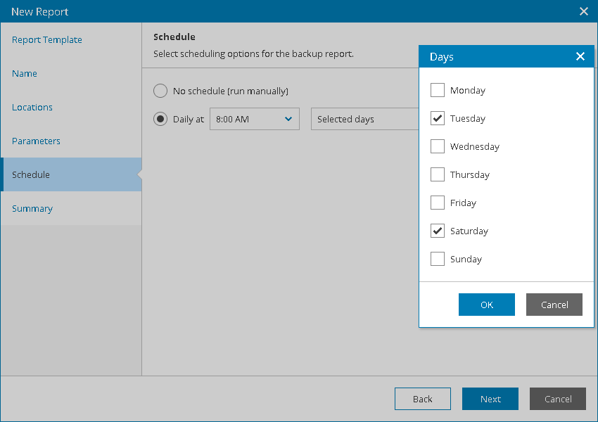 - At the Schedule step of the wizard, specify a schedule according to which the report must be generated and sent to companies: