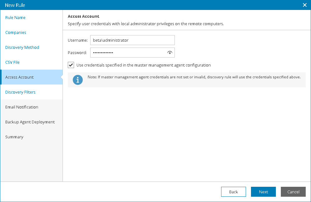 - At the Access Account step of the wizard, specify credentials of an account that the master agent will use to connect to computers within the discovery scope. The account must have local Administrator permissions on all discovered computers.