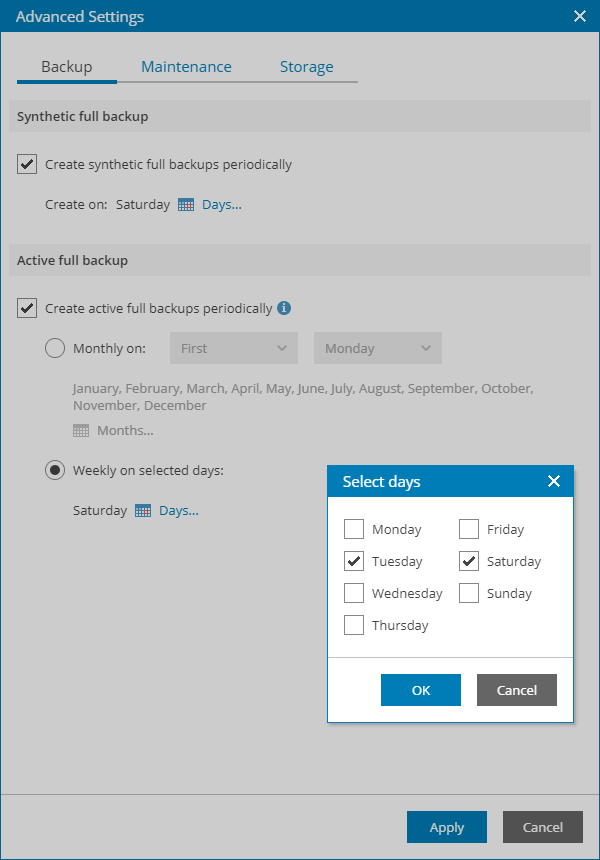 - If you want to periodically create synthetic full backups, select the Create synthetic full backups periodically check box and click Days to schedule synthetic full backups on the necessary week days.
