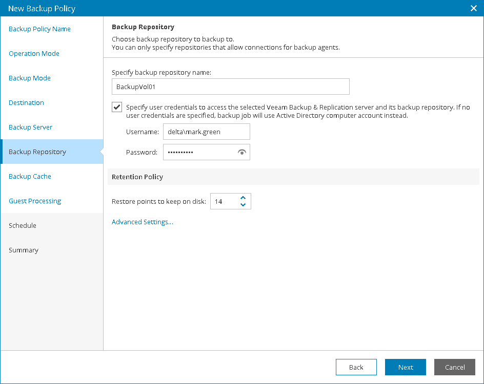 - Select the Specify user credentials to access the selected Veeam Backup & Replication server and its backup repository check box. In the Username and Password fields, specify a user name and password of the account that has access to this backup repository.
