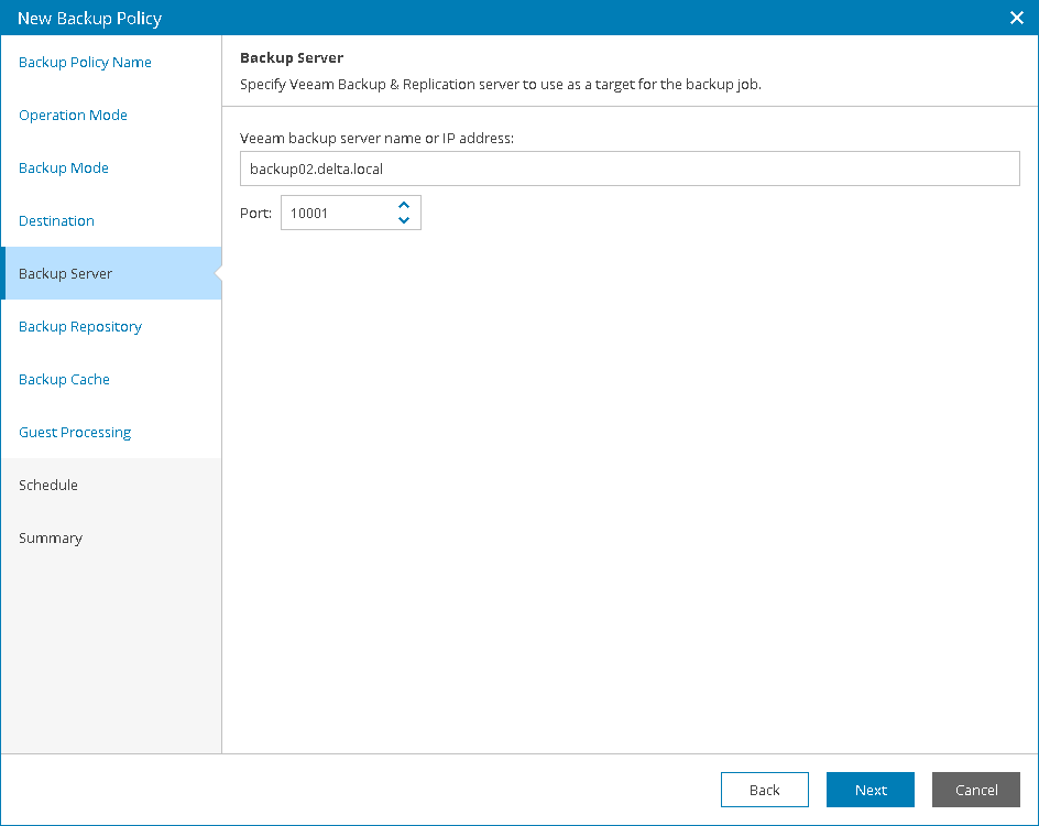 The Backup Server step of the wizard is available if at the Destination step you have chosen to store backup files on a Veeam Backup & Replication repository.