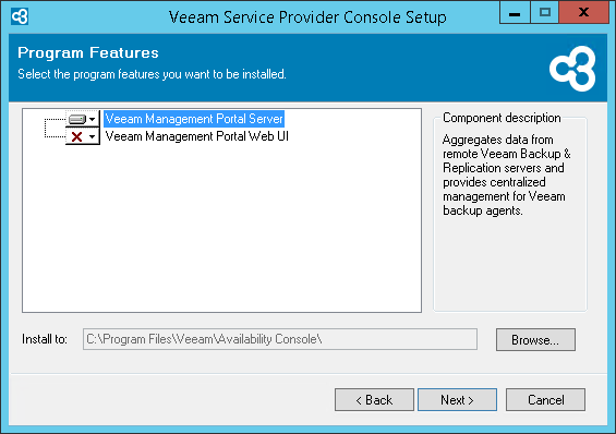 - At the Program Features step of the wizard, choose to install Veeam Service Provider Console Server only.
