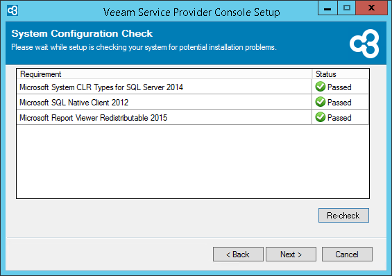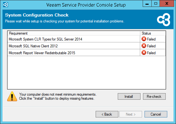 Before proceeding with the installation, the installer will perform system configuration check to determine if all prerequisite software is available on the machine. To learn what software is required for Veeam Service Provider Console, see System Requirements.