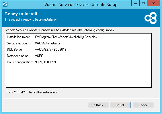 - At the Ready to Install step of the wizard, review the provided configuration settings and click Install.