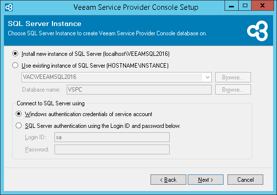 If this option is selected, the setup will install Microsoft SQL Server locally, on the machine where you are installing Veeam Service Provider Console, and will create a database with the default name VSPC.