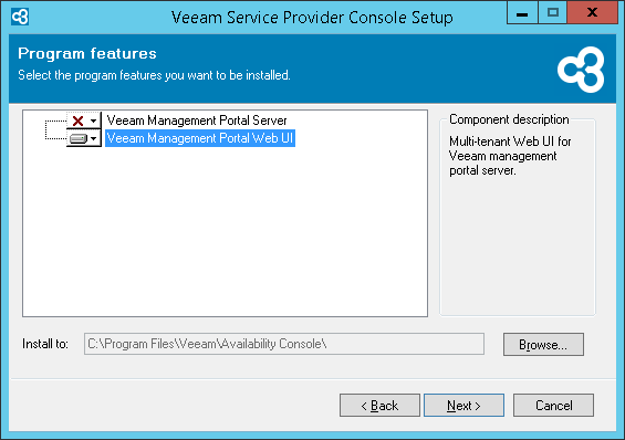 - At the Program Features step of the wizard, choose to install Veeam Service Provider Console Web UI only.