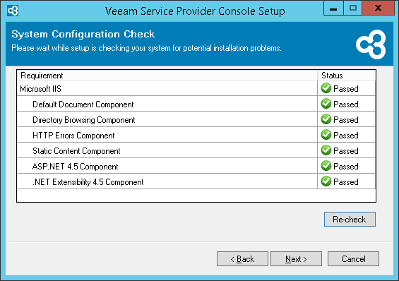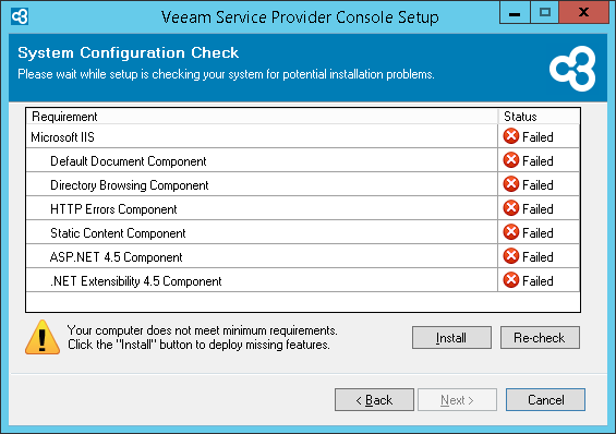 Before proceeding with the installation, the installer will perform system configuration check to determine if all prerequisite software is available on the machine. To learn what software is required for Veeam Service Provider Console, see System Requirements.
