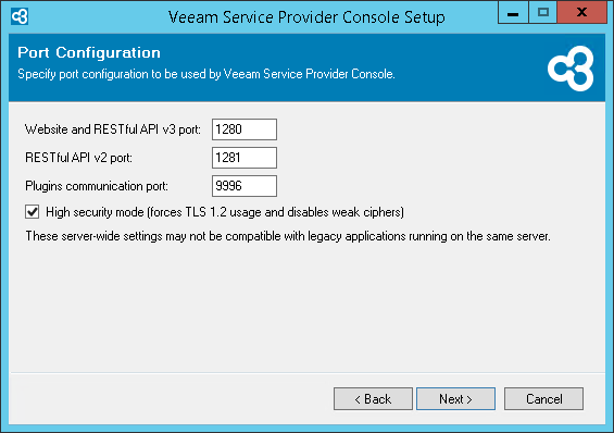 The High security mode option disables using weak ciphers for all communications with the machine on which Veeam Service Provider Console Web UI component runs. This may interfere with the operation of 3rd party software installed on the same machine. |