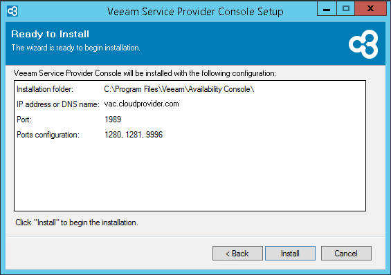 - At the Ready to Install step of the wizard, review the provided configuration settings and click Install.