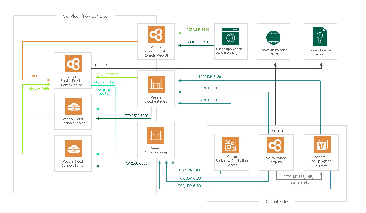 Cloud gateway | Veeam Cloud Connect server | TCP | 2500-5000 | Port range used during transfer of the management agent from the Veeam Cloud Connect server to a tenant’s backup server. The management agent transfer is performed when a Veeam Backup & Replication server is connected to Veeam Service Provider Console. |