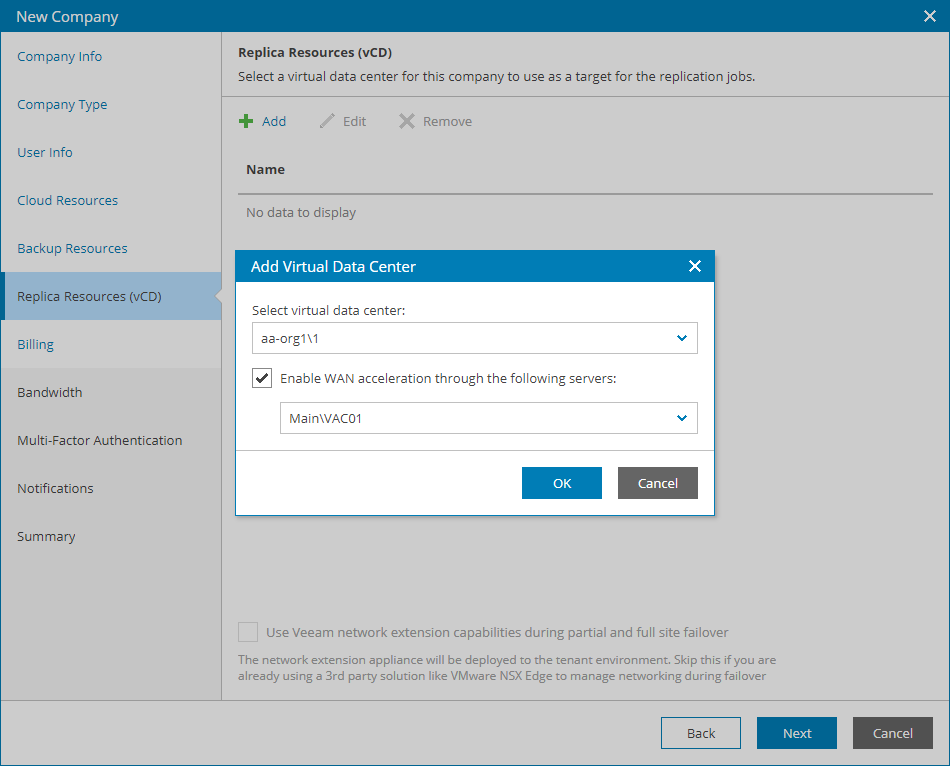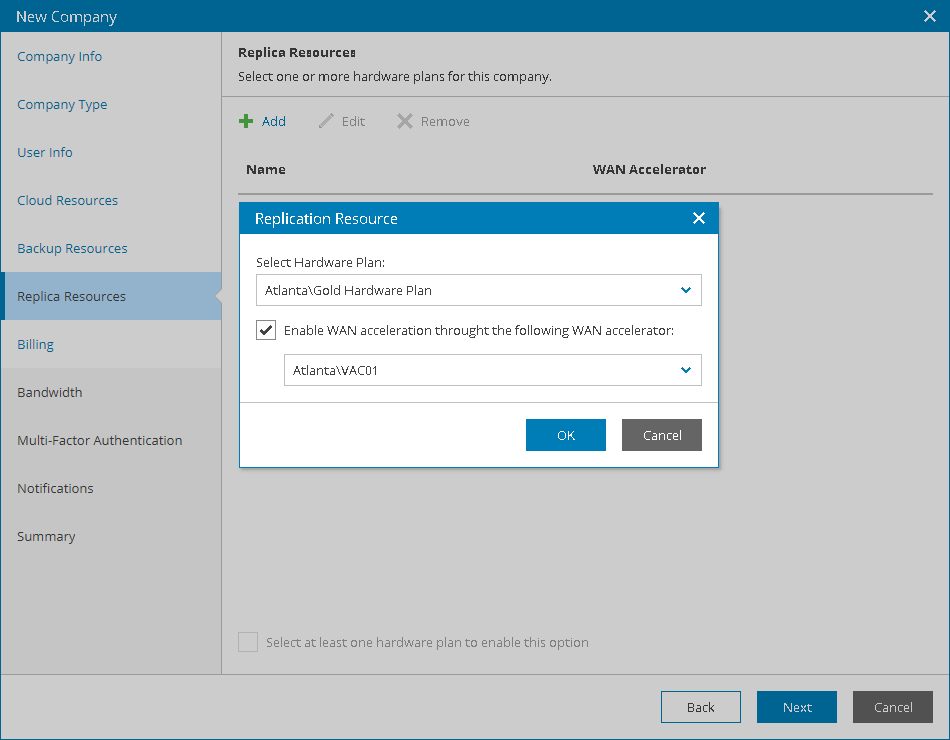 - If the company plans to use WAN accelerators for replication jobs, select the Enable WAN acceleration through the following WAN accelerator check box and choose a target WAN accelerator configured on the service provider side.
