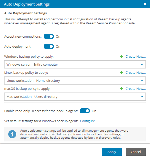 If you install Veeam backup agents outside Veeam Service Provider Console (manually or using 3rd party automation tools), you may need to configure auto deployment settings. Auto deployment settings define whether Veeam Service Provider Console must automatically register new management agents, and whether registered management agents must automatically install Veeam backup agent on hosting computers.
