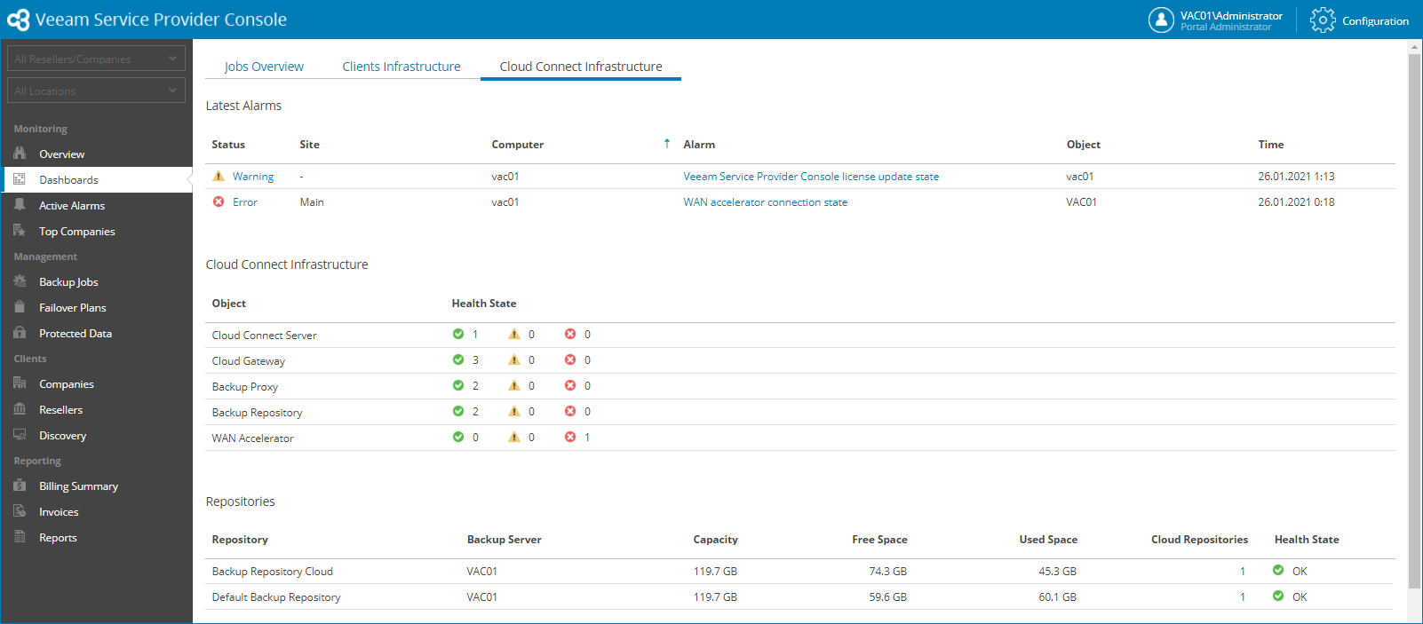 The Cloud Connect Infrastructure dashboard provides information about the Veeam Cloud Connect infrastructure health state, consumed and available repository resources, as well as hardware plan configuration details.