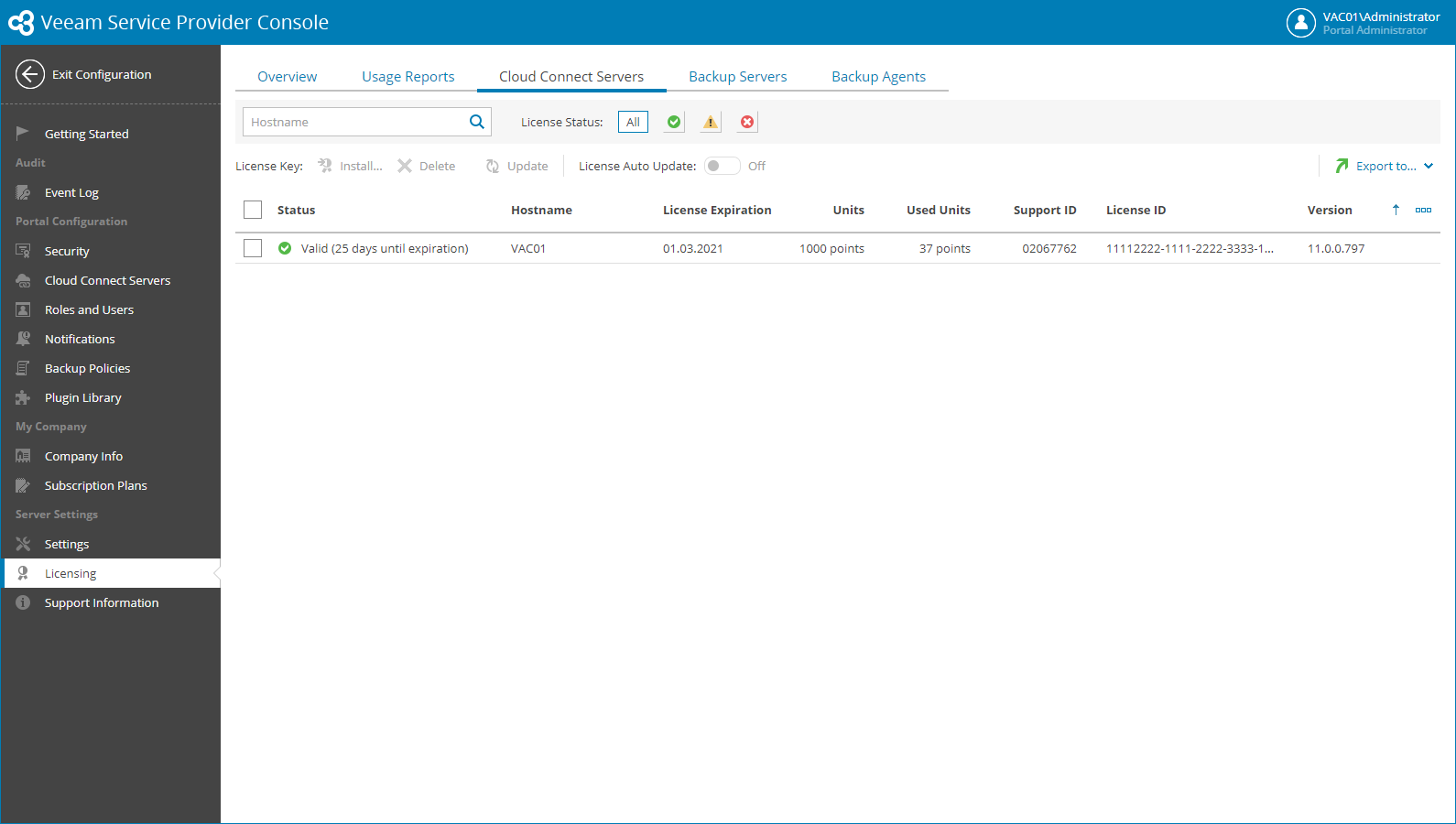 - Status — status of license installed on the Veeam Cloud Connect server (Valid, Warning, Expired).