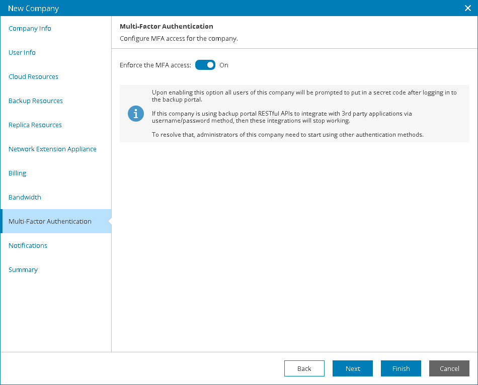 At the Multi-Factor Authentication step of the wizard you can assign a second authentication factor to all company users. For details on MFA, see Configuring Multi-Factor Authentication.