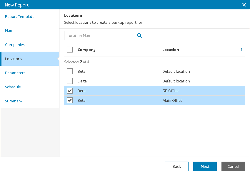 By choosing a location you can limit the scope of the report: only computers, VMs or file shares that belong to the chosen locations will appear in the report.