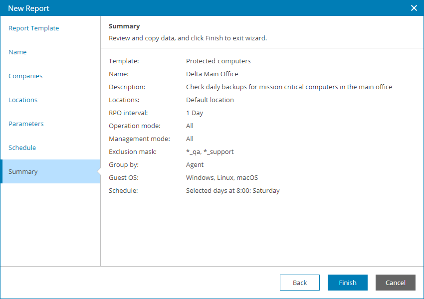 Before you run a backup report, you must create and save a report configuration. A report configuration stores custom report settings, such as the scope of the report, scheduling settings and so on. You can create multiple report configurations with different report settings for different companies and locations.