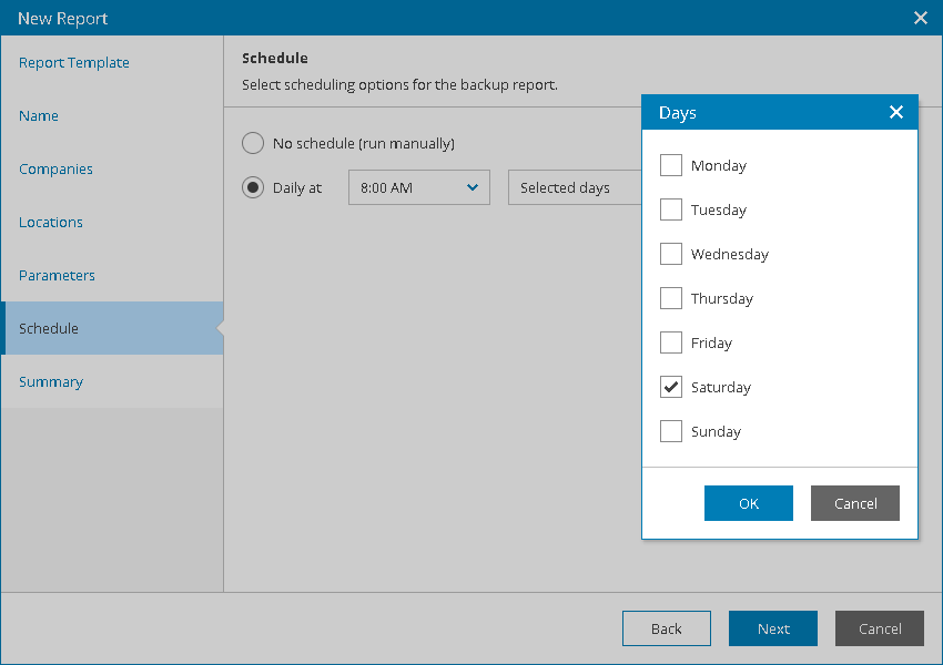 - At the Schedule step of the wizard, specify a schedule according to which the report must be generated: