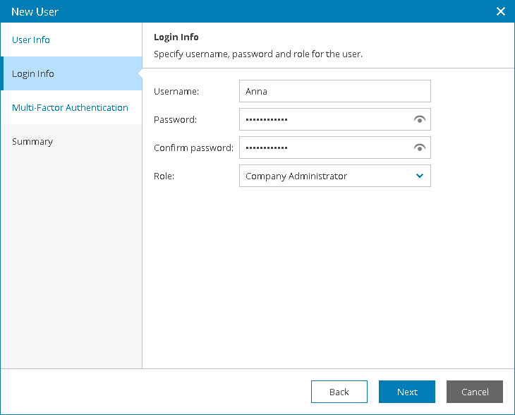 - At the Login Info step of the wizard, specify user credentials and choose a user role: